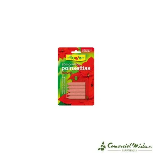 El abono en clavos para Poinsettias de Flower es un tipo de abono compactado diseñado para nutrir esta planta, conocida también como Flor de Pascua. La aplicación de este elemento consigue que las flores estén nutridas durante 30 días, potenciando su coloración y aportándole los nutrientes que necesita para un buen desarrollo. Esta planta tiene la particularidad de que las brácteas, hojas falsas, están coloreadas de forma irregular (rojizas, rosas y blancas) y se desarrollan en el extremo de las ramas. Las verdaderas flores son pequeñas y de color amarillo. Es muy común que esta planta pierda el color rojizo de las hojas, por lo que es necesario aportarle elementos esenciales para un buen desarrollo y mantenimiento. Gracias a los componentes de los clavos, nutren la planta con un NPK equilibrado, incentivando la generación de nuevas partes coloreadas y hojas. Con este abono, la planta se llena de vitalidad y tolera mejor los cambios de temperatura. La presentación en clavos facilita la aplicación: basta colocar un clavo a una cierta profundidad.