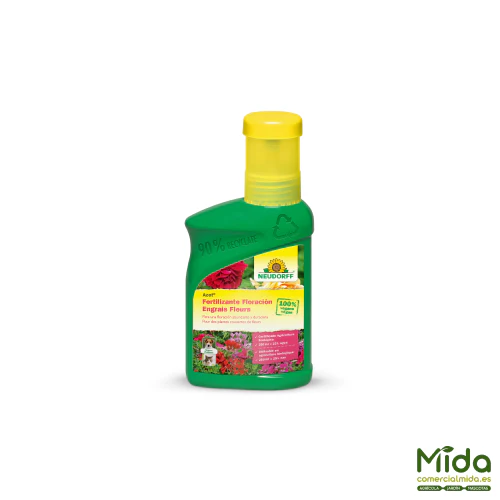 NEUDORFF Azet Fertilizante Floración es un abono orgánico líquido de origen vegetal formulado para potenciar una floración frondosa y colorida en plantas de interior y exterior. Su combinación especial de nutrientes, con especial protagonismo del potasio, favorece la formación de flores y el rendimiento ornamental. Complementa especialmente la nutrición de geranios y otras plantas de balcón, aportando de forma natural los oligoelementos necesarios. Es seguro para mascotas y está certificado para Agricultura Ecológica, ideal para un cuidado más responsable. Se presenta en formatos 250 ml y 1 L, con rendimientos adaptados al uso doméstico.