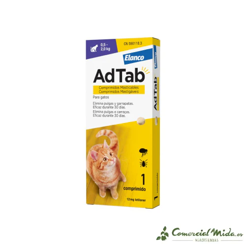 AdTab es un comprimido mensual masticable antiparasitario para gatos y gatitos a partir de 8 semanas de edad y 0.5 kg de peso. Estos comprimidos, al ser pequeños y altamente palatables, con un apetecible sabor a vainilla y levadura, facilitan su administración. Además, proporcionan una acción rápida contra las pulgas y garrapatas, brindando resultados eficaces en poco tiempo. Este producto ofrece una solución completa y efectiva para el control de pulgas y garrapatas en gatos y gatitos brindando seguridad y tranquilidad tanto para las mascotas como para sus dueños.