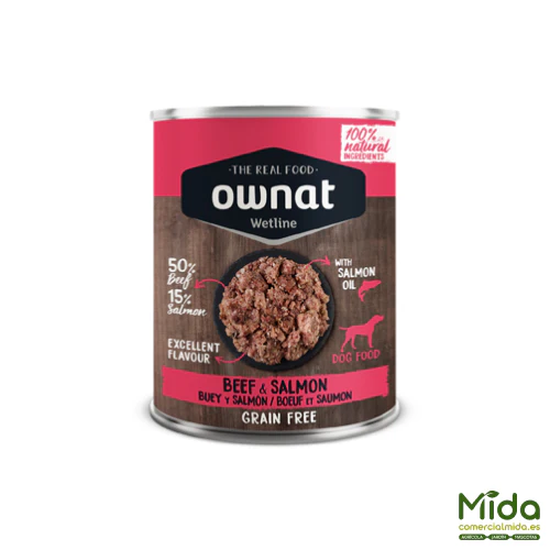OWNAT WETLINE Beef and Salmon (395 g) es un alimento húmedo completo para perros de todas las edades y tamaños, formulado con ingredientes 100% naturales y una palatabilidad muy elevada. Está elaborado únicamente con carnes de verdad (sin carnes reconstituidas, sin harinas y sin huesos) y, al ser sin cereales, favorece una digestión más ligera y es apto para perros con alergia o intolerancia a cereales o gluten. Combina buey y salmón para aportar variedad proteica y un sabor más intenso, siendo ideal para mezclar con pienso y mejorar la aceptación de la comida diaria.