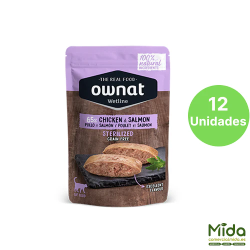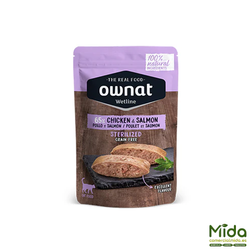 OWNAT Wetline Sterilized Chicken and Salmon, receta orientada a gatos esterilizados, que suelen presentar menor gasto energético y mayor tendencia al aumento de peso, por lo que un bajo % de grasa resulta coherente con el objetivo de control calórico.