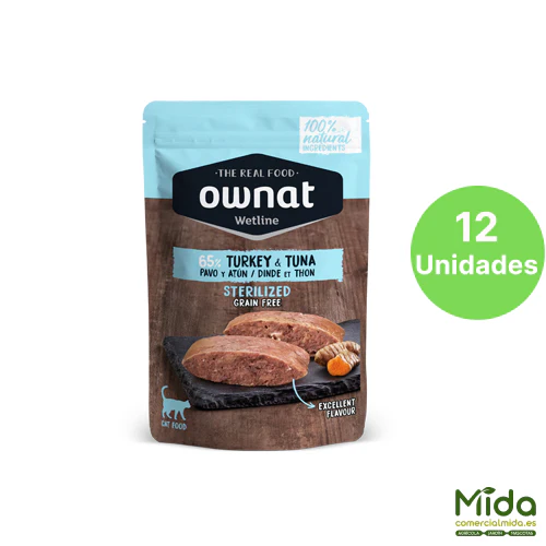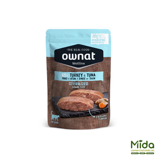 OWNAT Wetline Sterilized Turkey and Tuna, receta orientada a gatos esterilizados, que suelen presentar menor gasto energético y mayor tendencia al aumento de peso, por lo que un bajo % de grasa resulta coherente con el objetivo de control calórico.