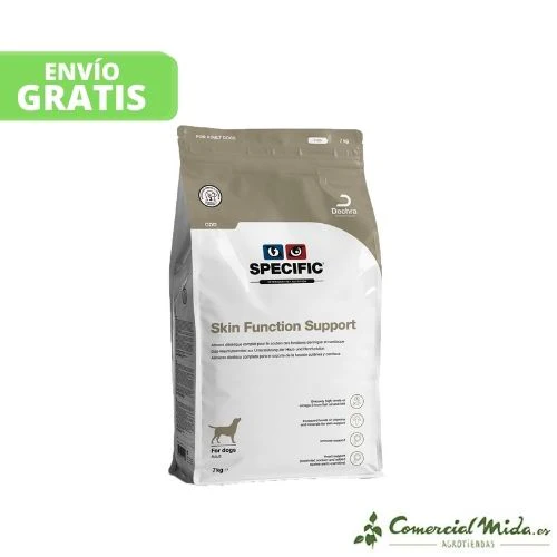 El alimento seco Skin Function Support COD de Specific es un pienso que proporcionará un soporte para mejorar la función de la piel de los perros, ya que cuenta con unos elevados niveles de aceites de pescado Omega 3. Es la comida ideal para ayudar a los perros que padecen afecciones cutáneas provocadas por alérgenos ambientales, además, también brinda apoyo a los perros que sufren problemas articulares, cardíacos o renales. Mejora la salud en general de los perros adultos. En nuestra tienda podrás encontrar este alimento en diferentes formatos.