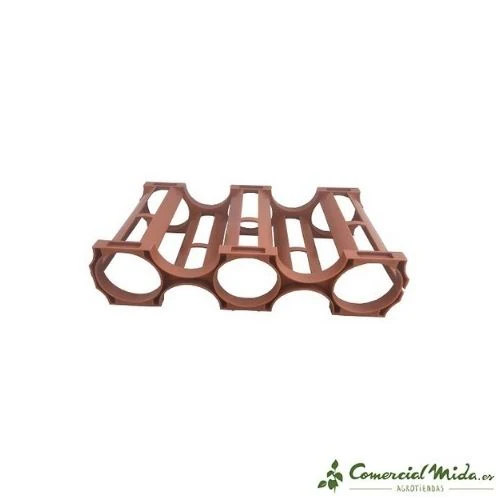 Botellero con capacidad de 5 huecos y apilable. Está fabricado con plástico resistente marrón.