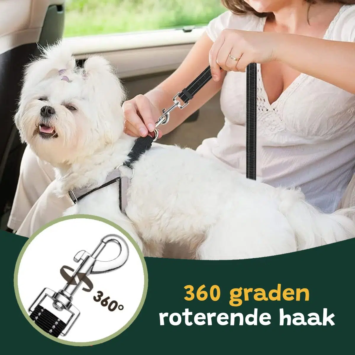 De hondengordel beschikt over 2 veilige bevestigingshaken waardoor je deze overal in (elke) auto goed kan bevestigen. Het maakt dus niet uit of je viervoeter in de kofferbak, op de achterbank, of voorin zit, met de hondengordel ga je altijd veilig op pad