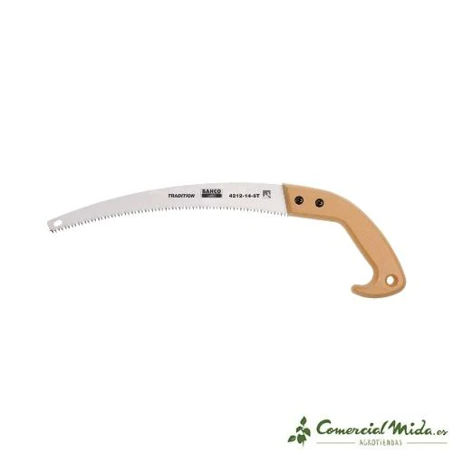 El serrucho de poda de Bahco es una herramienta de corte especialmente diseñado para madera seca o dura. Garantiza un corte rápido y limpio en zonas de difícil acceso de forma fácil y segura. La hoja es curva y cuenta con dentado reafilable que permite llegar a las zonas más altas. El filo cuenta con 6 dientes por pulgada que permite un corte agresivo y limpio. El mango está hecho en madera de haya, que garantiza un tacto suave, ligereza y comodidad en el agarre. Este serrucho de poda es muy resistente y fácil de limpiar y manejar.