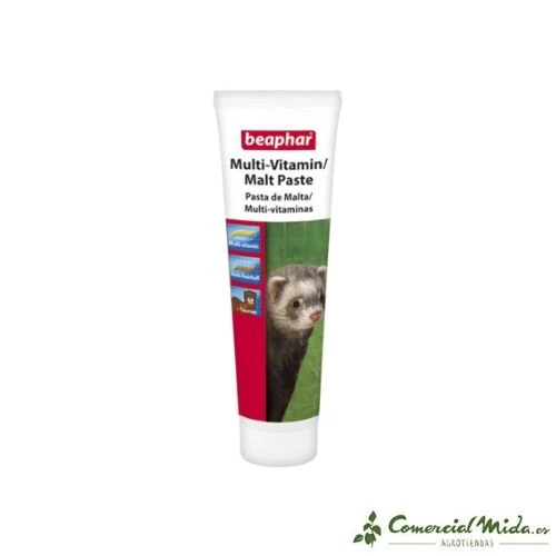 La pasta de malta para hurones de Beaphar es un producto que contiene 2 sustancias, la combinación de estas contribuye a obtener un pelo sano y resplandeciente favoreciendo la evacuación de las bolas de pelo del organismo del animal de manera natural. Esto contribuye a un buen funcionamiento de los intestinos. La pasta de color amarilla es una multi-vitaminada que incluye vitaminas y minerales que el hurón necesita para que su salud sea óptima, además, contiene Taurina, debido a que la mascota es incapaz de producirla de manera natural y debe estar presente en su alimentación diaria ya que es fundamental para mantener una buena vista en el animal y, además, ayuda a que el corazón funcione correctamente. La pasta de malta, es de color marrón y se encarga de envolver los pelos con una película que facilita su posterior evacuación por el tracto gastrointestinal.
