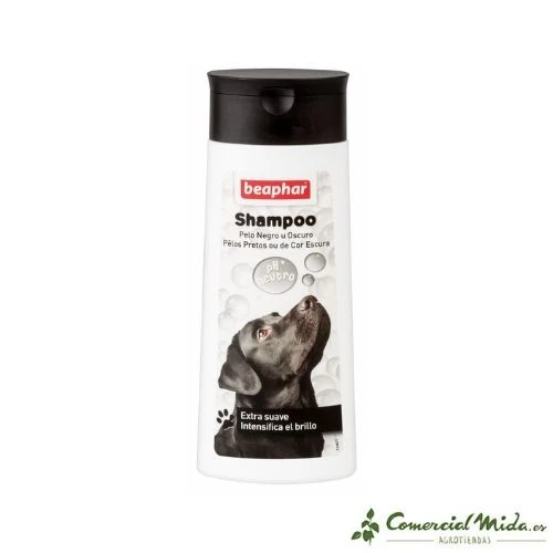 Champú para aplicar a los perros de pelo negro u oscuro. Favorece una higiene óptima. Disponible en dos tamaños.