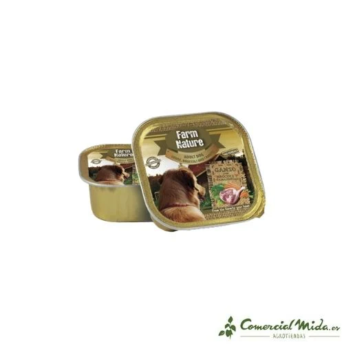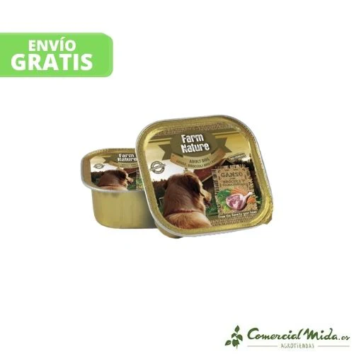 La comida húmeda de Farm Nature a base de carne de ganso con brócoli y zanahorias es un alimento ideal para completar la dieta de los perros adultos. La fórmula está libre de cereales, conservantes, saborizantes y colorante artificiales que puedan provocar malas digestiones o alergias. La carne de ganso es muy apetitosa y aporta gran vitalidad al organismo de los animales gracias a sus altos niveles de proteínas. Es una carne rica en Fósforo, Manganeso, Hierro y Vitaminas. Aún siendo una carne blanca, el ganso posee altas cantidades de Hierro, ideal para tratar y prevenir la anemia. Este tipo de alimento está cocinado al vapor y envasado de forma hermética para evitar que pierda ninguna de sus propiedades nutritivas. La combinación de elementos favorece elestado óptimo del sistema inmunológico, nervioso y el pelaje, para que se mantengan fuertes y sanos. Gracias al alto contenido en fibra, se previene el estreñimiento y mejora la calidad de las heces.