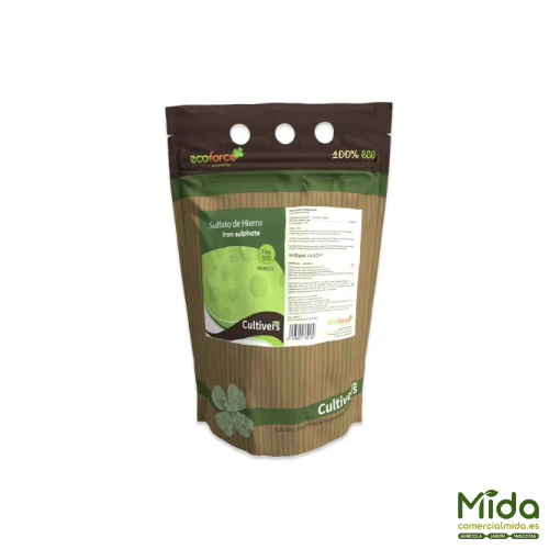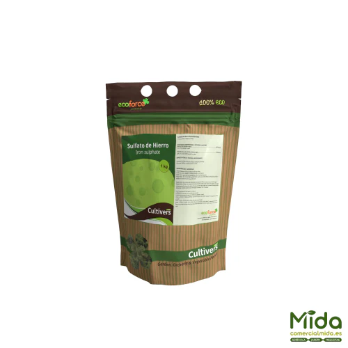 El sulfato de hierro (FeSO₄·7H₂O) es un corrector clásico para suelos y plantas con carencias de hierro, especialmente útil cuando aparece clorosis férrica (hojas amarillentas con nervios más verdes). Además de aportar Fe, contribuye a acidificar ligeramente el medio, favoreciendo la disponibilidad de otros nutrientes en suelos con tendencia a pH alto. Se presenta como cristalino de tonalidad verde y es soluble en agua, lo que permite su aplicación tanto disuelto como por reparto en superficie.