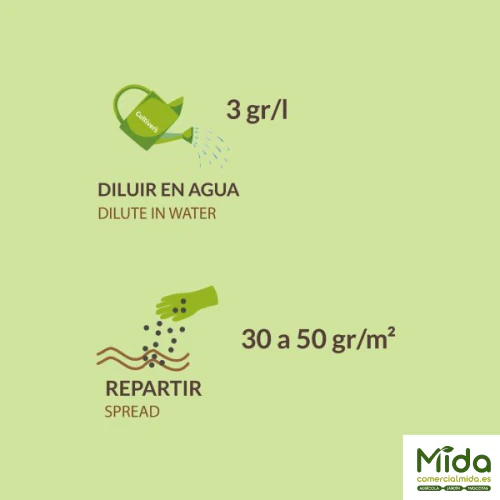 Repartir en superficie: 30 a 50 g/m², y regar después para facilitar su incorporación.