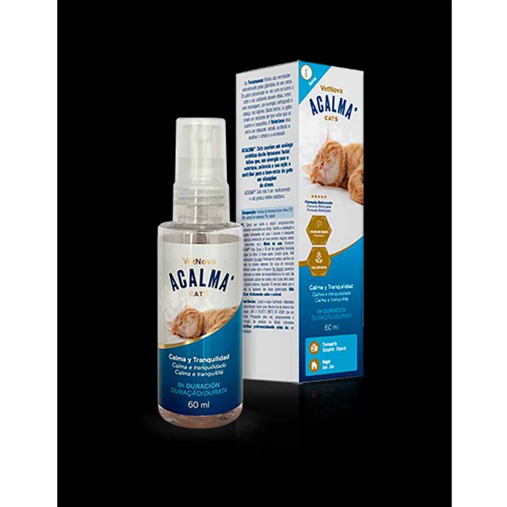 ACALMA® Cats es la solución anti-estrés que tu gato necesita. Su fórmula reforzada, con Análogo de Feromona Facial Felina (F3) y Extracto de Valeriana, potencia su acción y contribuye al bienestar de tu gato en situaciones de estrés.