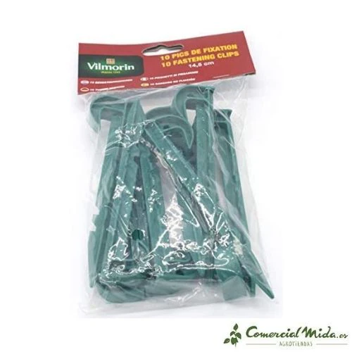 Los ganchos de fijación VILMORIN permiten que las telas, plásticos o mantas contra malas hierbas se sujeten firmemente a la tierra o terreno dónde plantamos nuestros cultivos y semillas. Fija de forma segura, rápida y fácil el mantillo cubre suelos y limita el crecimiento y expansión de maleza en el huerto y jardín.