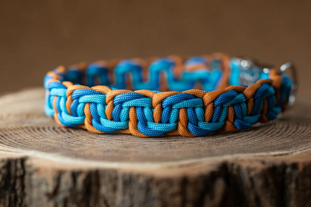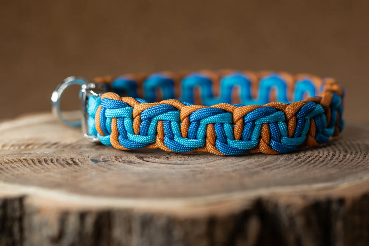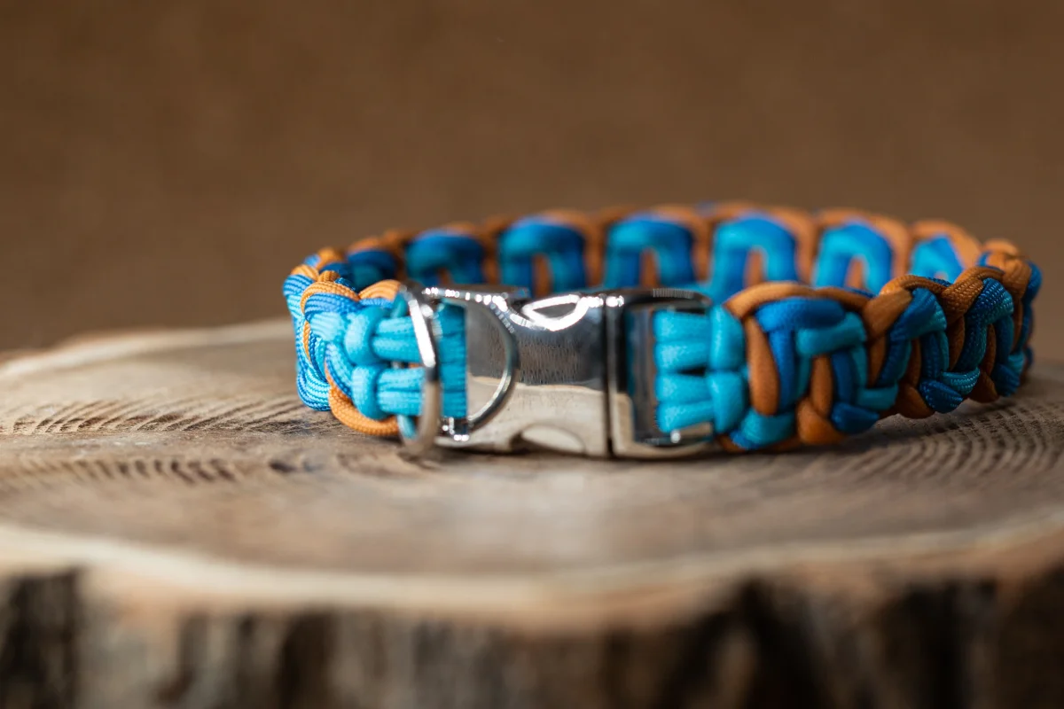 Met een vaste kliksluiting, of met een verstelbare biothane gesp. Door de knoop, het paracord touw en de sluiting is de halsband heel stevig en sterk.