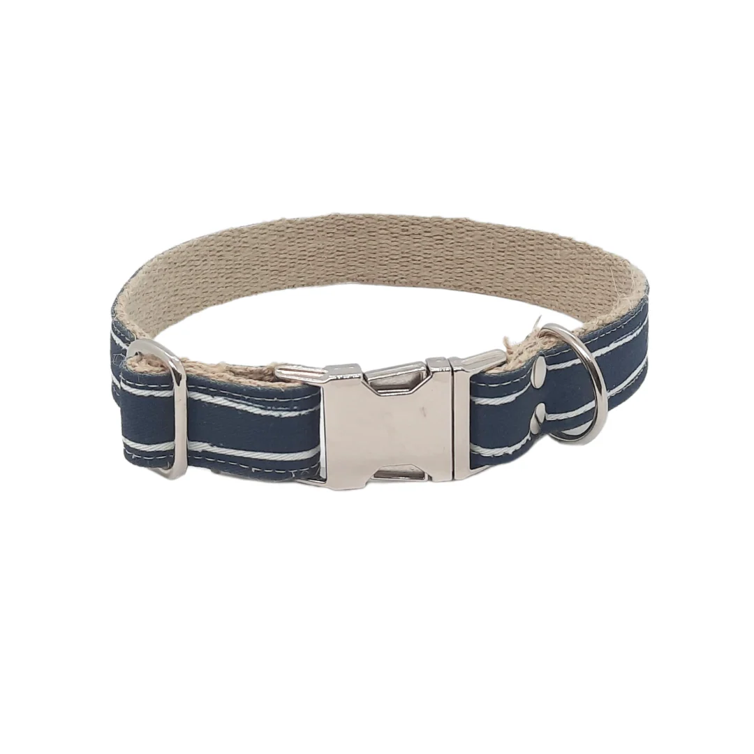 De halsband Azure is een halsband gemaakt van Europees hennep bedekt met een strook biologisch geteeld katoen met blauwe print. De veiligheid van jouw hond staat bij ons voorop. Elke halsband is afgewerkt met een hoge kwaliteit zilverkleurige of oud messing kliksluiting en d-ring voor het makkelijk verbinden van de riem aan de halsband.