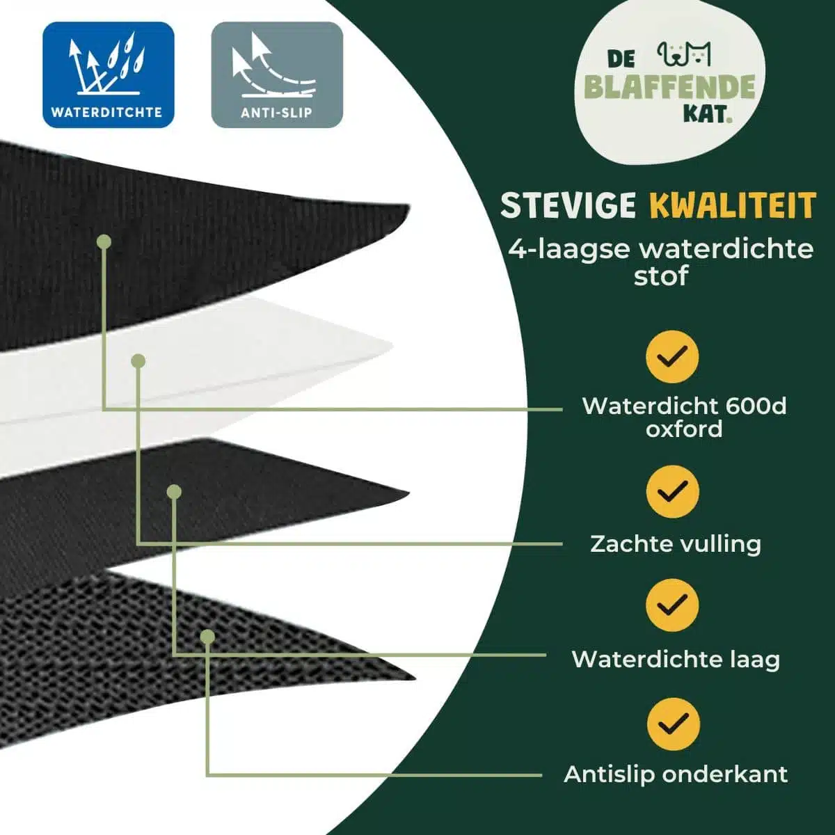 Onze kofferbak hondendekens zijn gemaakt van hoge kwaliteit 600D Oxford. Dit is stevig materiaal, en daardoor waterafstotend en krasvrij. Ook voorkomt dit nare luchtjes in de bekleding. Deze kofferbak beschermhoezen beschikken ook over een extra grote bumperbeschermings flap. Zo voorkom je krassen tijdens het in- en uitstappen.