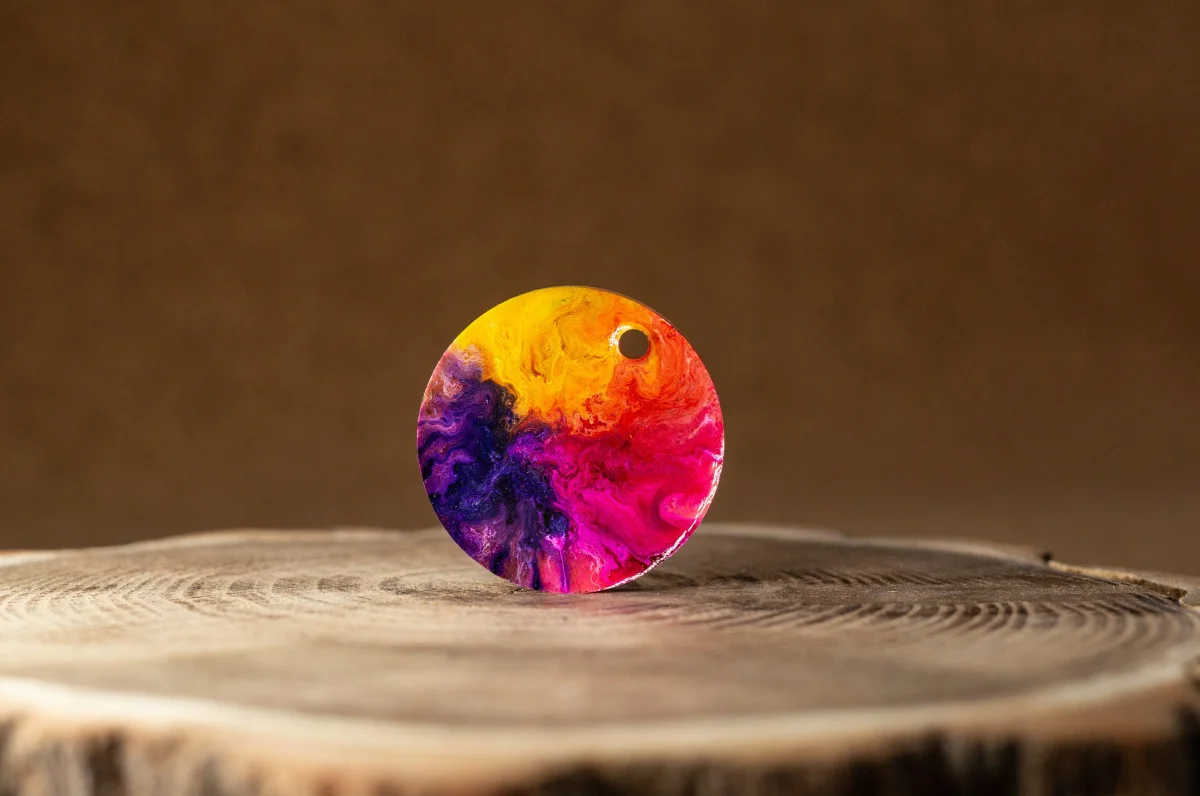 De Charlie hondenpenning combineert warm geel met roze en paars. Heel blij en zomers. Handgemaakt van sterk, lichtgewicht epoxyhars, waardoor elke penning uniek is.