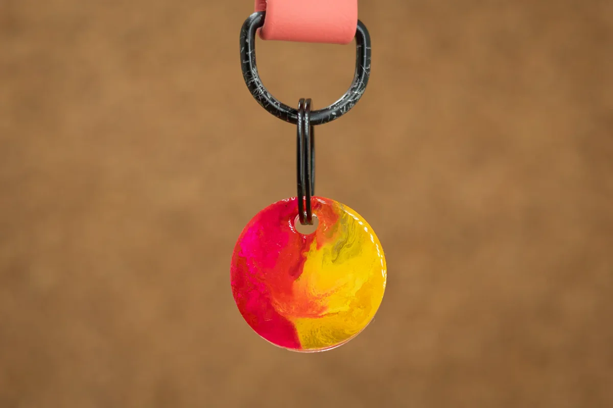 De Clay hondenpenning. Lekker fel geel met roze. Zomers toch!