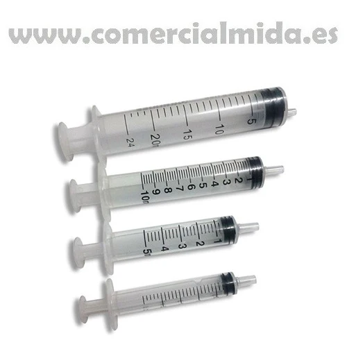 Jeringas desechables de plástico con indicador por ml y multi función para diferentes usos: administración de líquidos, tratamientos de pequeños volúmenes, bombeos de aceite, tinta, etc. Cada jeringa es estéril y desechable y está envasada de forma individal y no incluyen agujas.