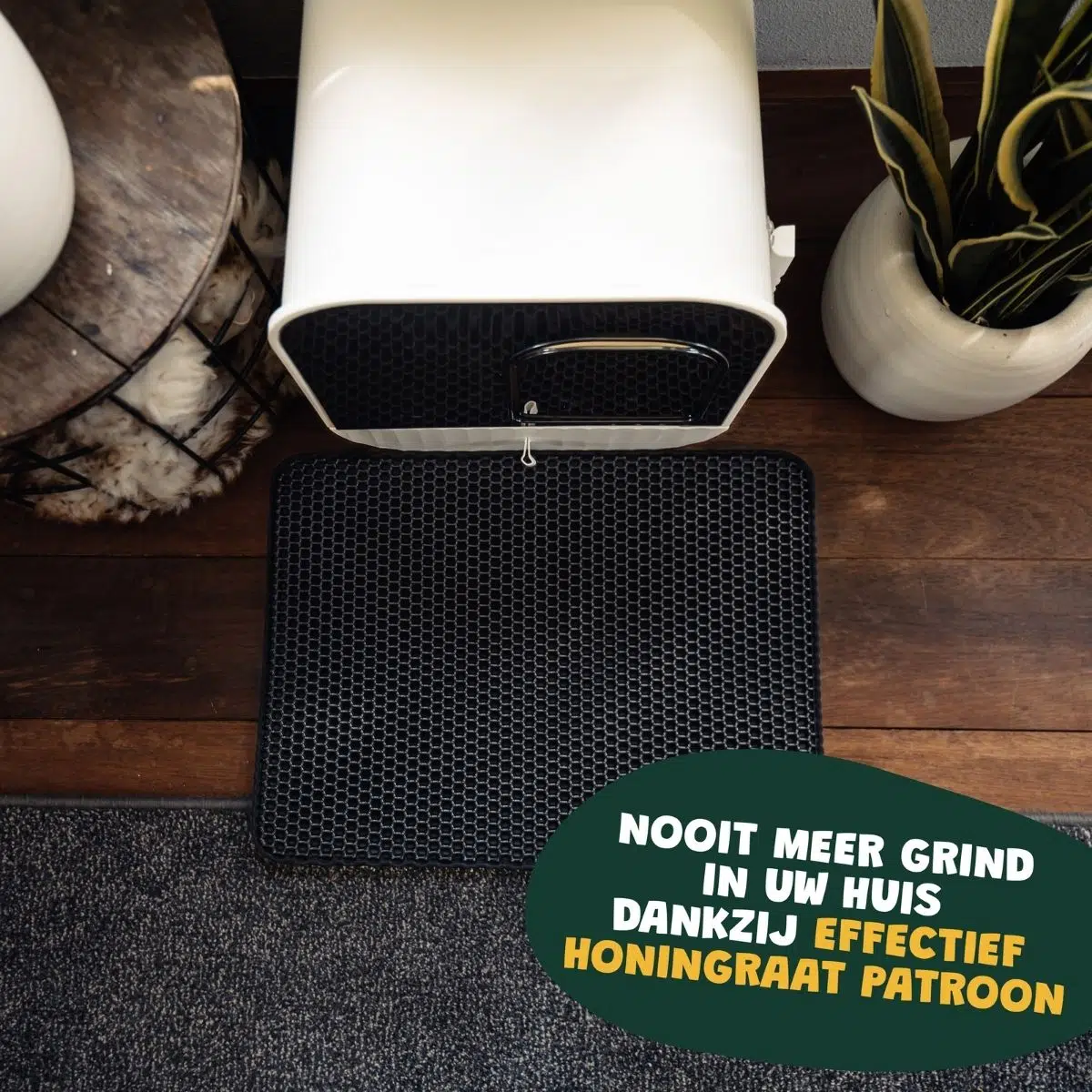 Houd je huis schoon en fris met De Blaffende Kat M Kattenbakmat. Deze mat is ontworpen om gemorst kattengrit op te vangen en verspreiding te voorkomen. Met zijn honingraatstructuur en dubbele waterdichte laag biedt hij maximale bescherming. Met een afmeting van 60 x 45 cm past de mat onder elke kattenbak en beschermt hij je vloer tegen gemorst grit en urine. De honingraatstructuur vangt het grit op terwijl je kat uit de bak stapt en voorkomt verspreiding door je huis. Dankzij de dubbele waterdichte laag lekken vloeistoffen niet door naar de vloer. Schoonmaken is eenvoudig door af te spoelen of af te vegen. De mat is gemaakt van duurzaam materiaal en geschikt voor binnen- en buitengebruik.