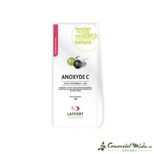 Anoxyde C es un antioxidante en polvo para la elaboración de vinos. Este producto de uso profesional está compuesto por Ácido L-Ascórbico puro que se usa en la enología por sus propiedades para evitar la oxidación del vino durante su producción, garantizando la conservación de los aromas y olores del vino. Este antioxidante también es conocido como E-300, según su código alimentario equivale a la vitamina C, más conocida por el público en general. Este compuesto es muy apreciado en el entorno enológico porque es un antioxidante muy poderoso que evita que se conoce como quiebra férrica del vino, un proceso en el que los componentes de hierro que el vino tiene de forma natural se oxidan enturbiando el líquido y picando el vino. La composición del antioxidante E-300 está libre de elementos cancerígenos o peligrosos para la salud. De todas formas, la dosis límite de ácido ascórbico permitida es de 25 gr/hl.