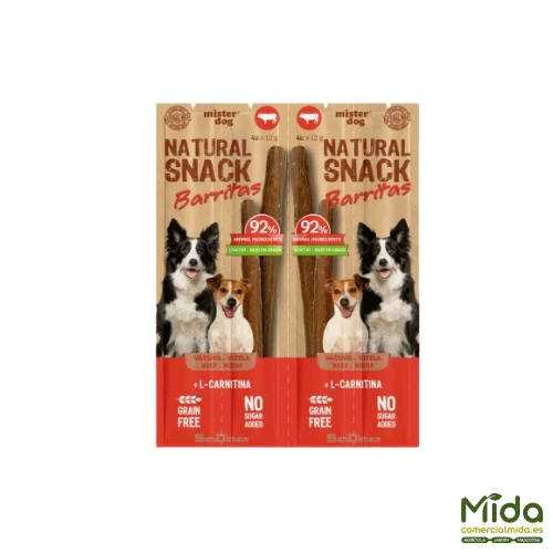 Las Barritas Natural Snack son un alimento complementario para perros, diseñadas para ofrecer un premio irresistible y saludable en cualquier momento del día. Elaboradas con una formulación grain free, bajo contenido en grasa, con L-carnitina y sin azúcares añadidos, son la opción perfecta para cuidar a tu mascota sin renunciar al sabor. Ideales como recompensa diaria, combinan nutrición y placer en cada bocado.