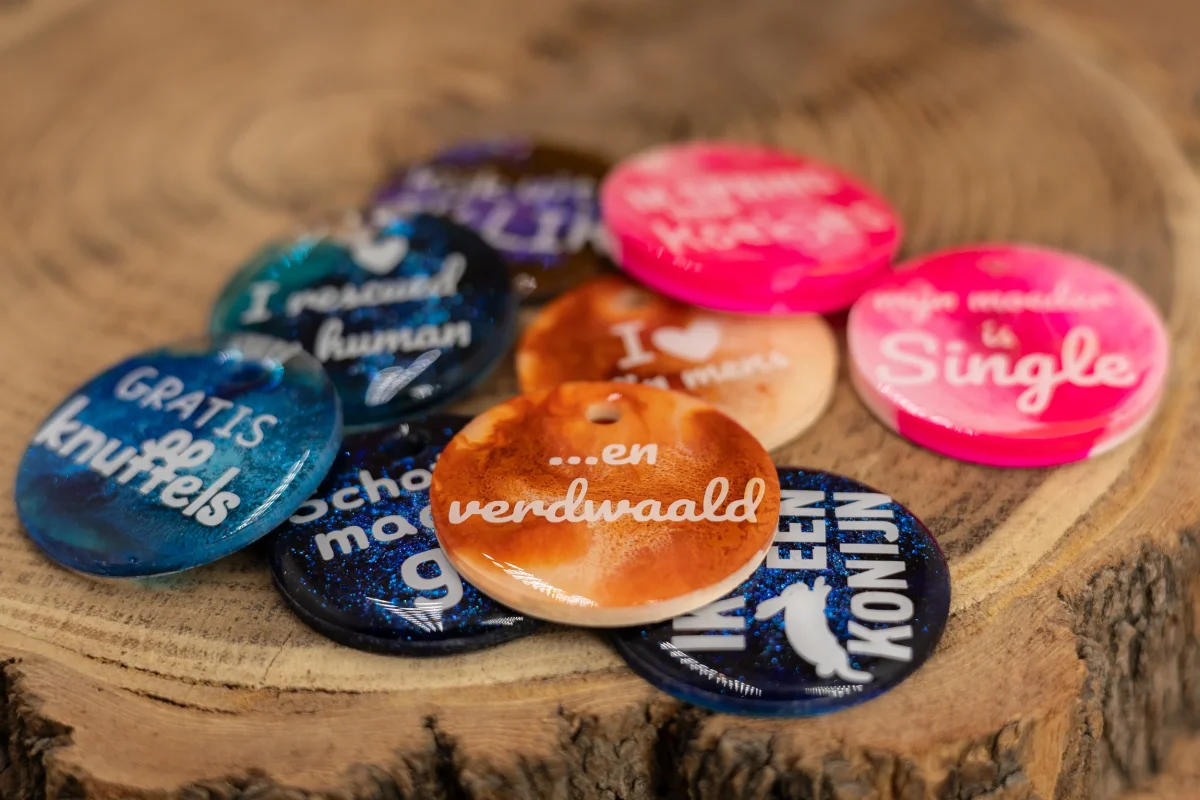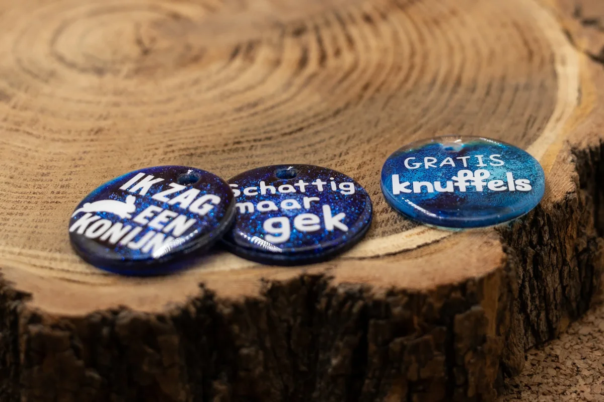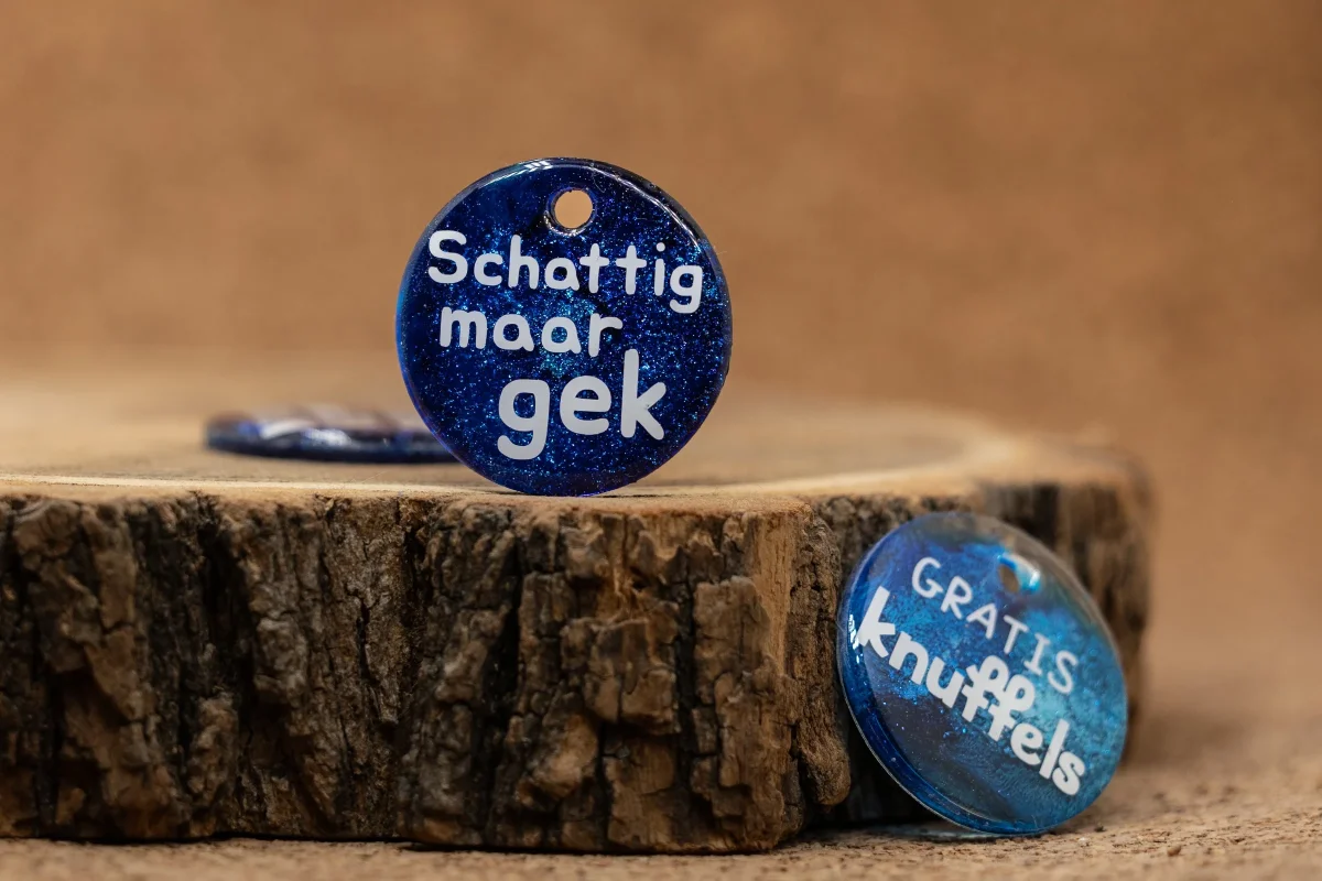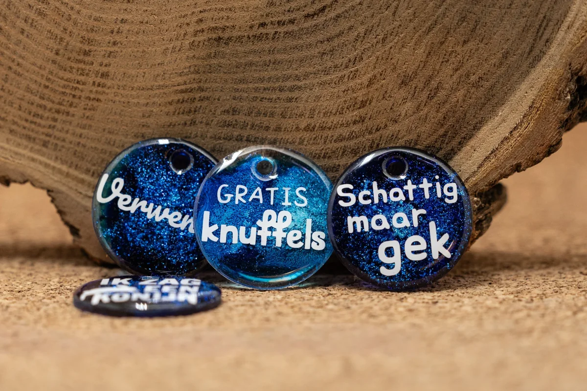Of je hond nu graag knuffelt of konijnen achterna zit (al dan niet met opzet). Elke penning wordt met zorg gemaakt en is een eyecatcher aan de halsband.