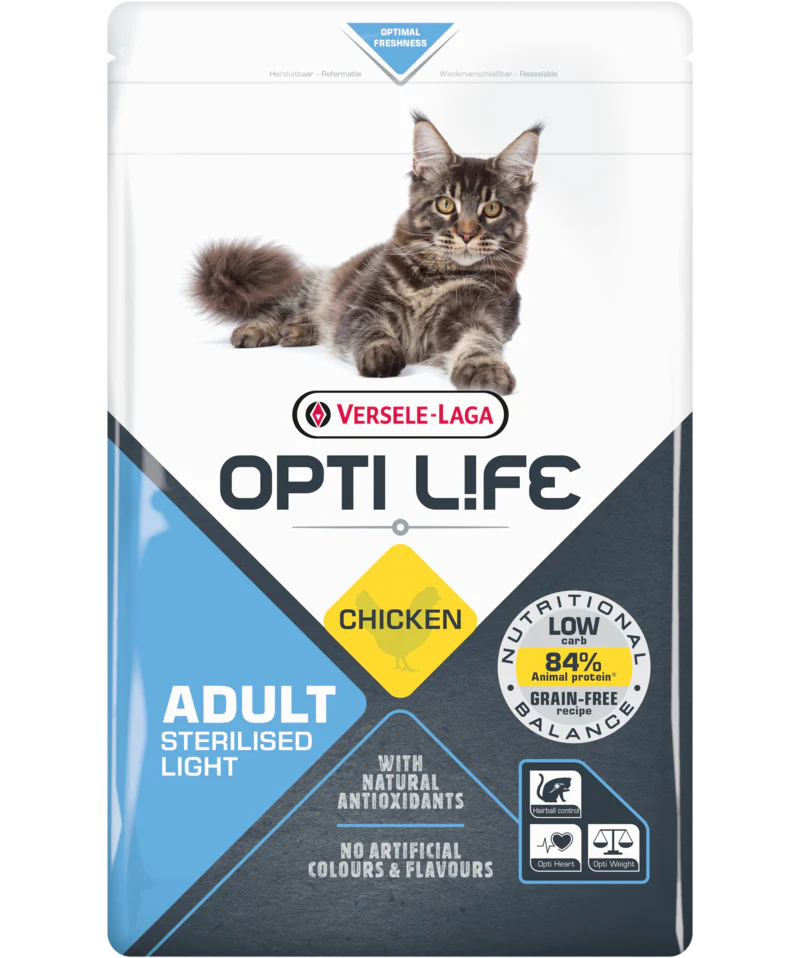 Opti Life Sterilised/Light is een perfect nutritioneel uitgebalanceerde formule op basis van kip, laag in koolhydraten en granenvrij, die het lichaamsgewicht van jouw kat helpt op peil te houden.