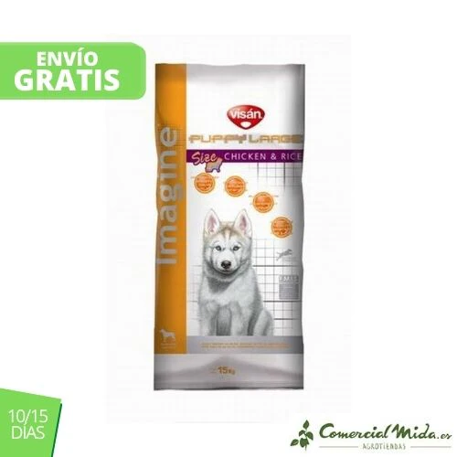 Imagine Cachorro Grande Pollo y Arroz es un pienso con elementos nutritivos para perros cachorros de razas grandes a partir de los 2 hasta los 15 meses de edad, así como también para perras embarazadas y que están en período de lactancia de razas grandes.