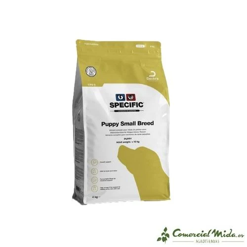 Puppy Small Breed CPD-S de Specific es un alimento seco indicado para cachorros de razas pequeñas. Está elaborado con ingredientes de elevada calidad que proporcionan todos los nutrientes que el animal necesita para que el desarrollo óseo y muscular sea el adecuado. Se considera perro de raza pequeña aquel que en su edad adulta tiene un peso inferior a 10 kg. Se puede ofrecer este alimento a los perros que tienen 5-6 semanas de vida hasta que cumplen los 10-12 meses, también se puede ofrecer como alimento a las perras reproductoras, gestantes y lactantes así como a los animales que padecen anorexia o están en un estado convaleciente. La administración de este pienso contribuye al crecimiento ya que le proporciona al animal altos niveles de energía, proteínas, vitaminas y minerales que sumado al elevado contenido en DHA favorecen un correcto desarrollo cerebral y visual.