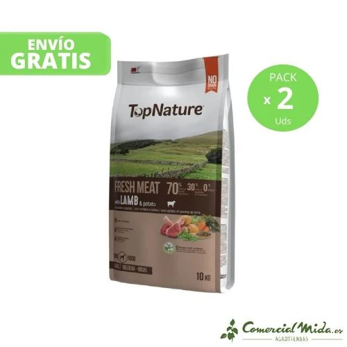 TopNature presenta un pienso diseñado para completar la dieta de los perros de razas medianas y grandes. Este pienso grain free está totalmente libre de cereales y gluten que provocan tantos problemas digestivos y alergias en los animales. La receta está elaborada a base de carne de cordero premium y rica en proteínas de alta calidad. Incluye vegetales, frutas y verduras de absorción lenta y altamente digestibles. Su bajo nivel de carbohidratos reduce las alergias y las patologías derivadas de las intolerancias. La fórmula cuenta con probióticos y prebióticos que mejoran el tránsito de la flora intestinal, con ayuda de los ácidos grasos Omega-3 que contribuyen a mejorar y fortalecer el pelaje. Estos ácidos funcionan como perfecto antiinflamatorio natural. Con la ayuda de la glucosamina y condroitina, mejora la movilidad de las articulaciones y fortalece los huesos. Este pienso refuerza el mantenimiento del tracto digestivo y facilita la asimilación de los nutrientes esenciales.