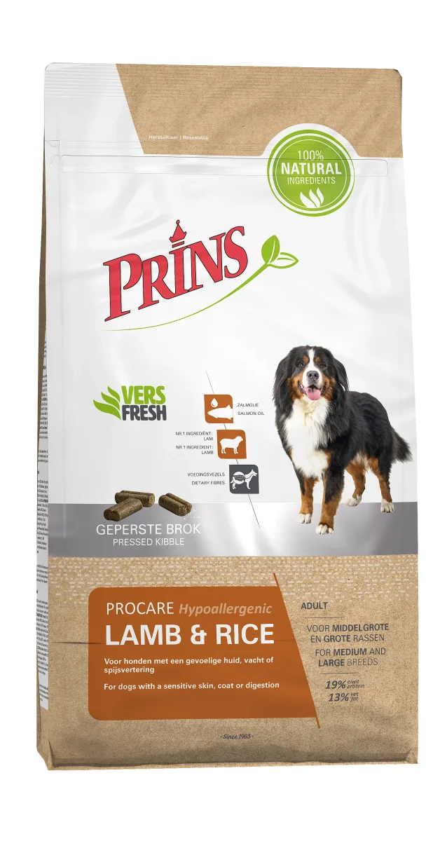 ProCare LAMB & RICE HYPOALLERGIC kan droog gegeven worden. Bereiding is niet nodig. Zorg dat er altijd vers drinkwater op kamertemperatuur ter beschikking staat. Verdeel de dagportie ProCare LAMB & RICE HYPOALLERGIC over minimaal twee maaltijden per dag. Wilt u uw volwassen hond eens extra verwennen, biedt het dan één of meerdere dagen achtereen Prins TotalCare Lamb & Rice Complete of Prins NatureCare LAMB aan. Dit zijn gezonde en natuurlijke vleesmaaltijden voor uw hond. Overige bijvoeding wordt afgeraden. ProCare LAMB & RICE HYPOALLERGIC is bijzonder geschikt voor volwassen honden van alle rassen vanaf een leeftijd van ca. 12 maanden. Meng gedurende minimaal 7 dagen steeds meer nieuwe voeding door de oude voeding tot u geheel bent overgestapt.
