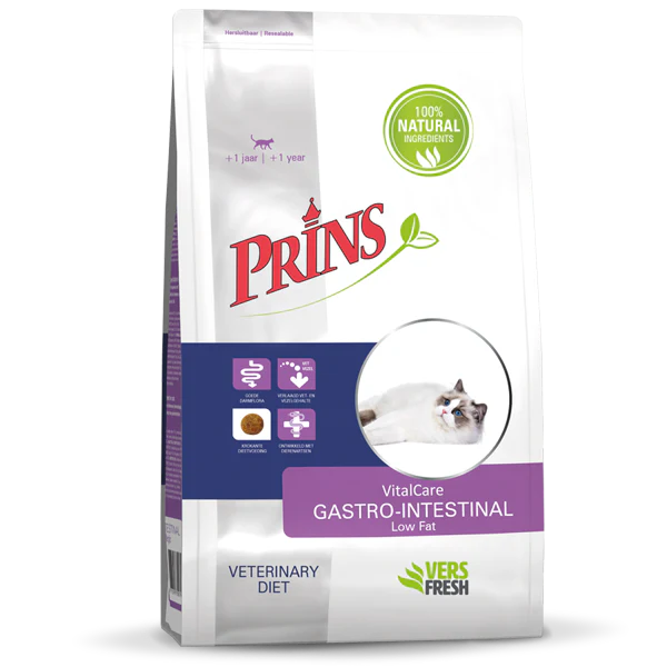 Maagdarmproblemen, zoals diarree of wisselende ontlasting komen vaak voor bij katten. Bij maagdarmklachten is er meestal geen sprake van goed gevormde ontlasting, maar ook spugen wordt regelmatig gezien. Prins VitalCare Veterinary Diet Gastro-Intestinal Low fat, een volledige dieetvoeding voor katten met maag-darmproblemen. Deze voeding bevat een lager vet- en vezelgehalte om de spijsvetering te ondersteunen en om te zorgen voor een licht verteerbare voeding. De voeding is hypoallergeen, wat betekent dat de voeding alleen zalm bevat als dierlijke eiwitbron om de kans op een overgevoeligheidsreactie te verminderen en bevat daarnaast nog extra ingrediënten voor een evenwichtige darmflora.