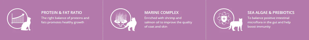 - Marine complex (garnalen + zalmolie) om de kwaliteit van de vacht en huid te verbeteren.