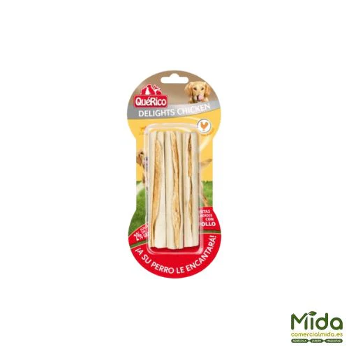 Con alto contenido en proteínas y solo un 2% de grasa, es una opción equilibrada ideal para el día a día. Y lo mejor: está elaborado sin colorantes ni conservantes artificiales. Preferido por 8 de cada 10 perros frente a otros snacks masticables, QuéRico Delights es mucho más que un premio: es cuidado dental, entretenimiento y sabor en un solo producto. Una delicia para morder… que a tu perro le encantará.