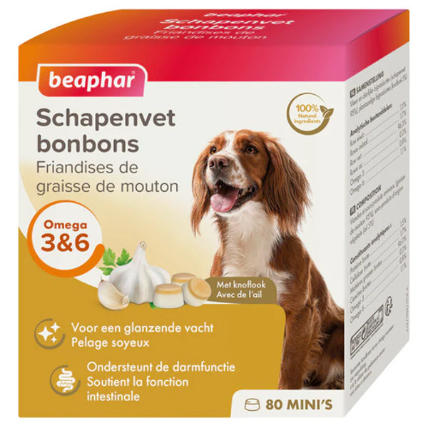 De originele Beaphar schapenvet bonbon knoflook is een natuurlijk en bijzonder probaat middel ter ondersteuning van afweer, huid, vacht, (spijs)vertering en weerstand. Weg met vlo en teek. Het is tevens een uitzonderlijk gezonde en smaakvolle toevoeging op de dagelijkse voeding. Ook geschikt voor honden met een voedselallergie die een dieet krijgen op basis van lamsvlees.