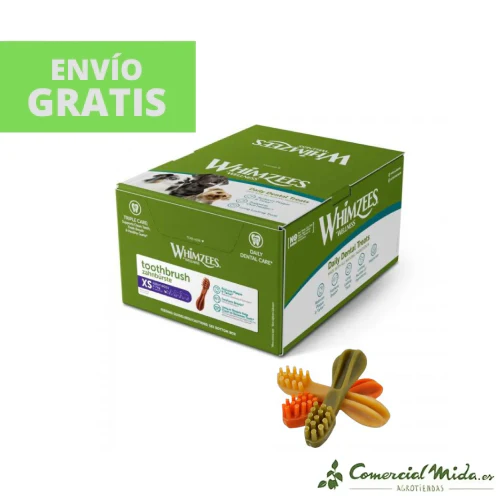 Los SNACKS WHIMZEES TOOTHBRUSH XS en forma de cepillo de dientes ofrecen una combinación perfecta de cuidado dental y placer de masticar para perros mini (hasta 4 kg de peso). Sus diseños únicos y su textura basada en vegetales no solo promueven la limpieza dental, sino que también contribuyen al flujo sanguíneo entre las encías, previniendo el mal aliento y la acumulación de placa y sarro dental.