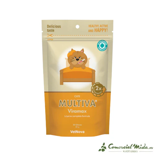 Multiva Viramax de Vetnova es un suplemento alimenticio rico en L-Lisina que ha sido formulado en chews de gran sabor para que su administración a los gatos sea más sencilla. Este alimento complementario es ideal para aquellos adultos que tienen un peso bajo, ya que tienen una concentración óptima de nutrientes que son favorables para su salud. El ofrecimiento de este complemento alimenticio es seguro y por ello es posible tomarlo a largo plazo o de por vida sin que suponga ningún riesgo a mayores para el animal.