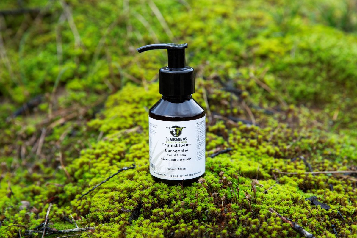 Teunisbloem-borageolie van De Groene Os is een krachtige, zuivere olie die rijk is aan essentiële vetzuren. Deze natuurlijke olie ondersteunt de huid, vacht, slijmvliezen en de hormonale balans van paarden en pony’s van binnenuit, als aanvulling op de dagelijkse voeding.