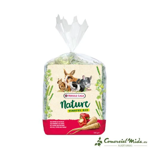 El heno de hierba enriquecido con pimiento y chirivía es el alimento completo y esencial que necesitan los roedores como conejos, cobayas, chinchillas o degúes para alimentarse. Este heno está compuesto por hierba timotea, que tiene un gran aroma y pimiento y chirivía que poseen una gran cantidad de vitamina C.