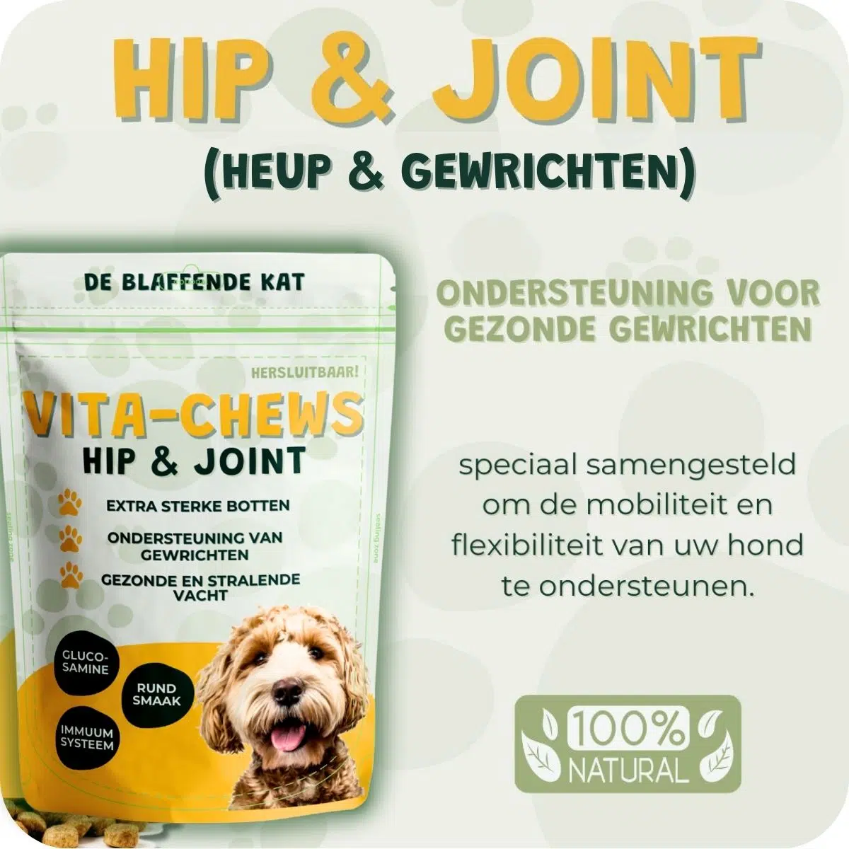 Bij De Blaffende Kat begrijpen we hoe belangrijk het is om de gewrichten van uw hond gezond te houden. Onze Vita Chews Heup & Gewrichten supplementen zijn speciaal samengesteld om de mobiliteit en flexibiliteit van uw hond te ondersteunen. Deze kauwtabletten zijn gemaakt met hoogwaardige, natuurlijke ingrediënten die zorgvuldig zijn geselecteerd in samenwerking met dierenartsen en experts. Bovendien werken we samen met Nederlandse leveranciers die al meer dan 10 jaar ervaring en expertise in de branche hebben.
