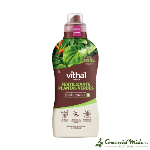 El fertilizante para Plantas Verdes Biosphere Plus de Vithal Garden es un abono líquido de fácil aplicación rico en aminoácidos para conseguir una mejora del verdor, biomasa y las defensas de las plantas.