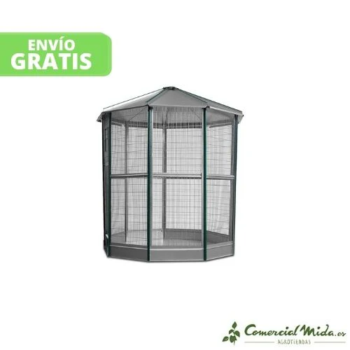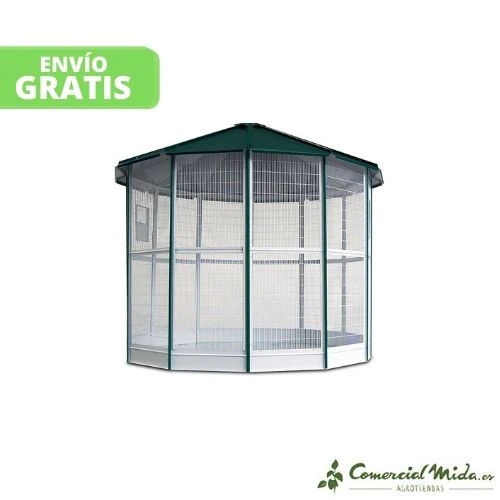 Gómez y Crespo presenta voladeras para aves fáciles de montar, resistentes y completas. La gama de pajareras diseñada en materiales cromados que evitan la oxidación y corrosión que la humedad y la contaminación ambiental pueden ocasionar sobre el hierro, está disponible en varios modelos: voladero de 6, 9 o 12 lados. Este tipo de jaulas tiene amplias dimensiones, ideales para aves de todo tipo y tamaños (loros, cacatúas, canarios, ninfas, búhos, mirlos, palomas…) para su ubicación en fincas, parques y jardines. El montaje, mediante paneles, es sencillo e incluye puerta con acceso al interior (uno de los paneles que forma el voladero viene en dos partes y la parte de abajo se levanta para poder acceder al interior del mismo) cuenta también con trampilla para la manipulación de accesorios. El voladero de 6 lados es el único que incluye una base. Está fabricado en chapa y alambre galvanizados, con paneles blancos y perfil y techo pintados en color verde que entonan muy bien con el entorno al aire libre.
