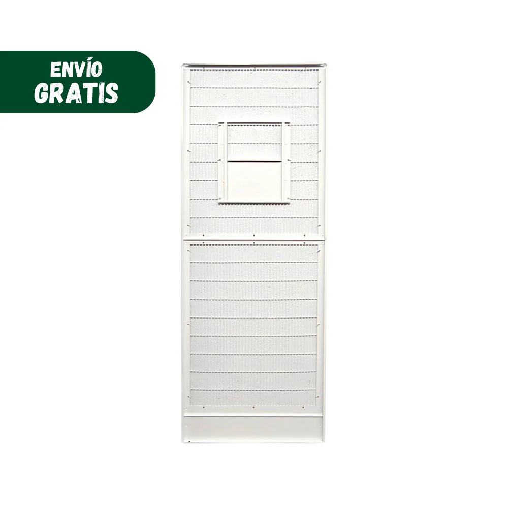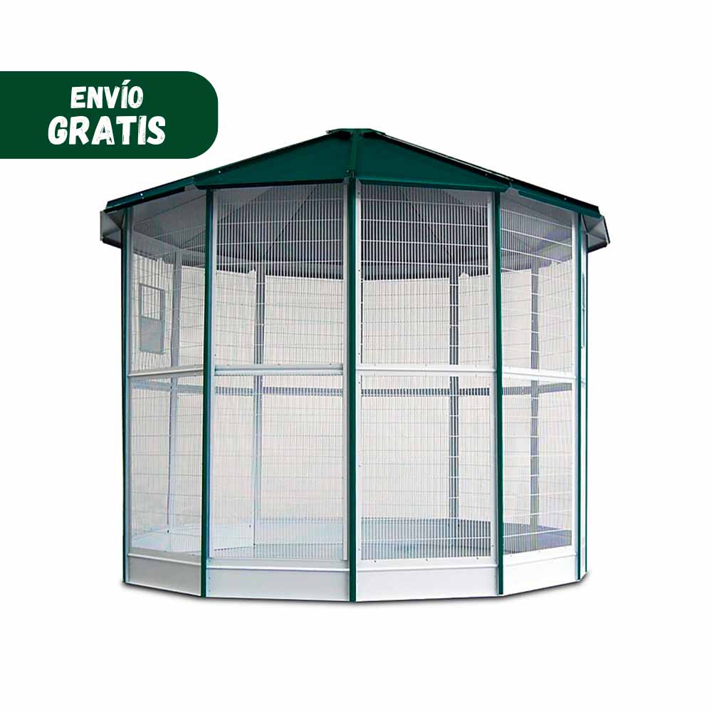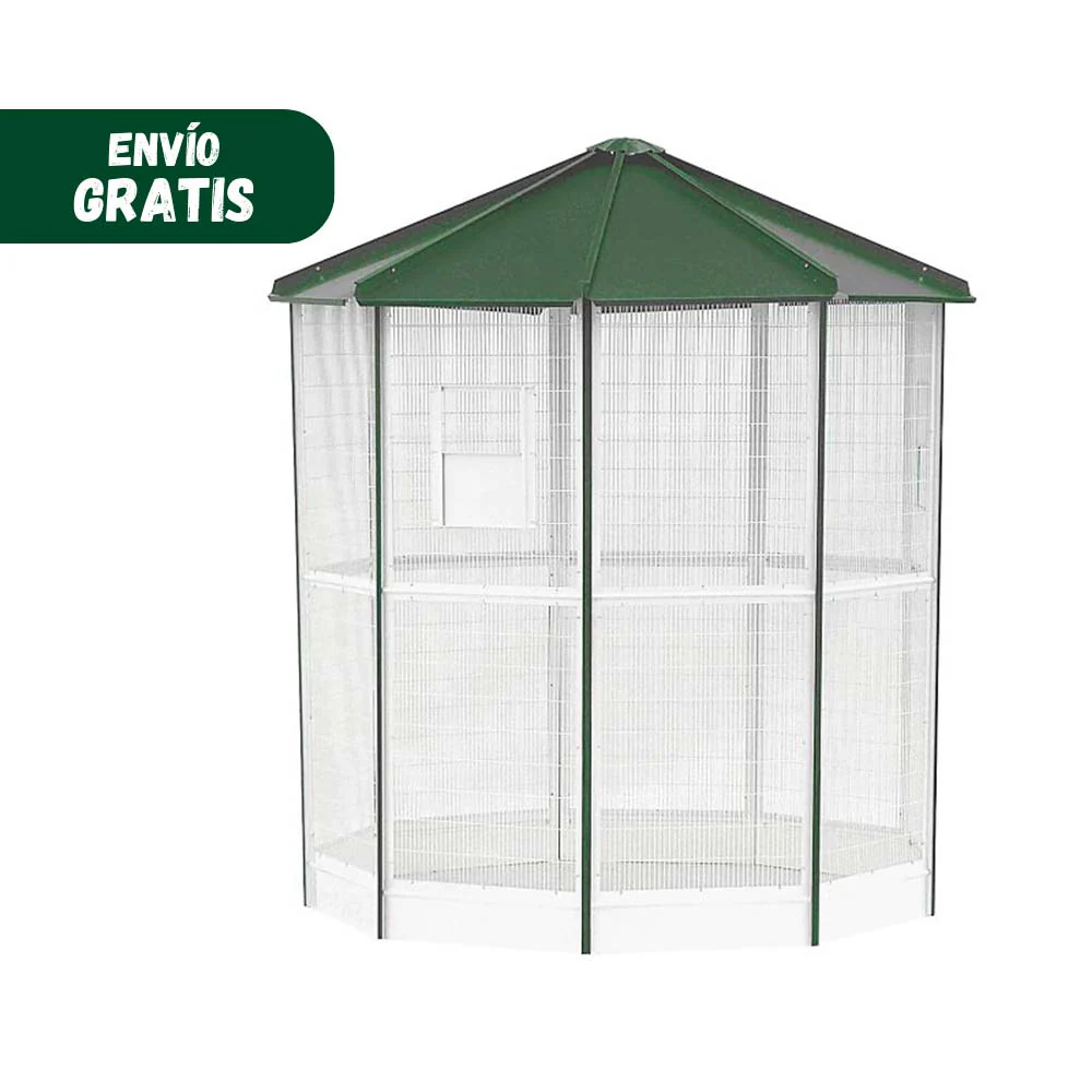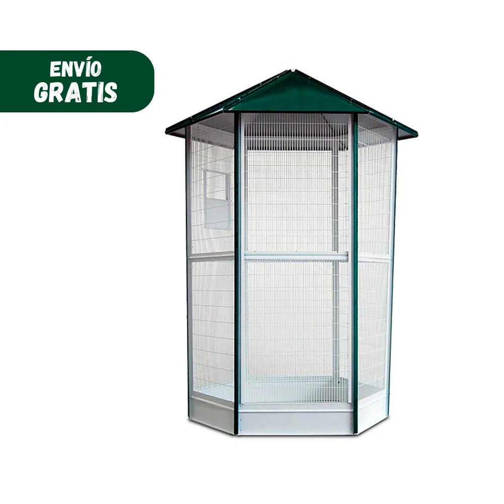 Los voladeros de Gómez y Crespo permiten proporcionar y mantener el bienestar de las aves en su día a día. Existen diferentes gamas de pajareras: con 6, 9 o 12 lados. Aquí te presentamos una selección de los accesorios indispensables para el correcto y completo montaje de la voladera que más se ajuste a tus necesidades y las de tus mascotas. El montaje, mediante paneles, se completa con piezas como la base para el voladero de 6 lados, tupida y con altura para evitar la entrada de animales peligrosos que puedan perturbar la presencia de tus pájaros, panel liso, panel con ventana y con puerta, el panel con puerta es un panel dividido en dos partes, la inferior se levanta para permitir el acceso al interior del voladero, perfiles de techos… Todos ellos ajustables a las estructuras de 6, 9 o 12 lados. Todos los elementos están diseñados sobre materiales acabados en lacado, que favorecen la dureza, calidad y durabilidad. Los perfiles y el techo están pintados en color verde y los paneles blancos entonan muy bien con el entorno al aire libre.